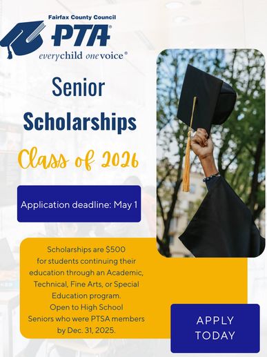 • Graduate from a Fairfax County Public Schools (FCPS) high school that has an active PTSA in good standing with Virginia PTA and FCCPTA as of December 31, 2025;
